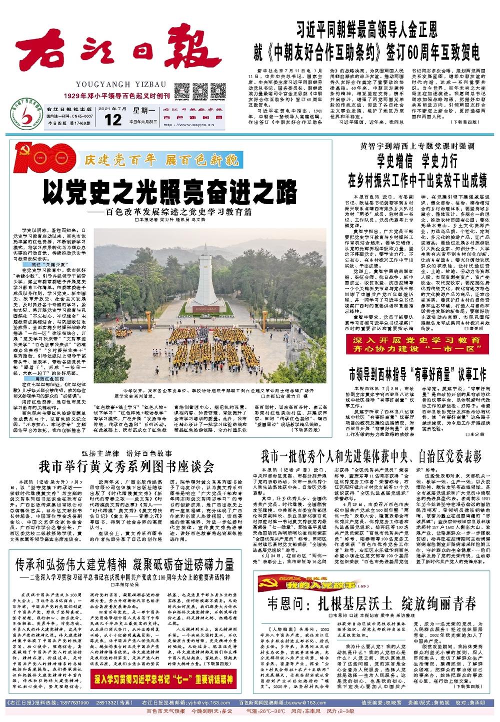 亲自题写《右江日报》报名,报纸为八开两版,不定期出版。《右江日报》是当时红军中最早创办的一张铅印报纸。在《中国人民军队报刊史》一书中所列举的在第二次国内革命战争时期国内革命根据地所创办的43种红军报刊中,其中只有4家是铅印报纸,从时间顺序来看,创办最早的当属1929年12月11日百色起义前夕创办的红七军机关报《右江日报》。1930年2月,红七军撤离百色,由于遭到敌人的围剿和封锁,《右江日报》被迫停刊。
